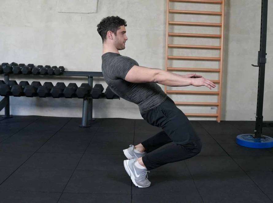 4. Mantenendo il petto alto e i gomiti completamente estesi, iniziate il movimento verso il basso piegando i fianchi, per eseguire uno squat.